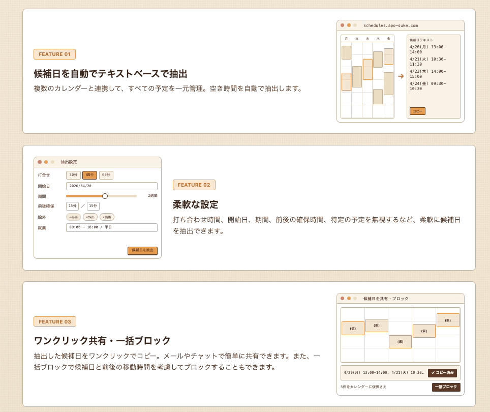 実際のアポスケの画面、自然言語で候補日抽出→テキスト生成→一括ブロックの様子 |