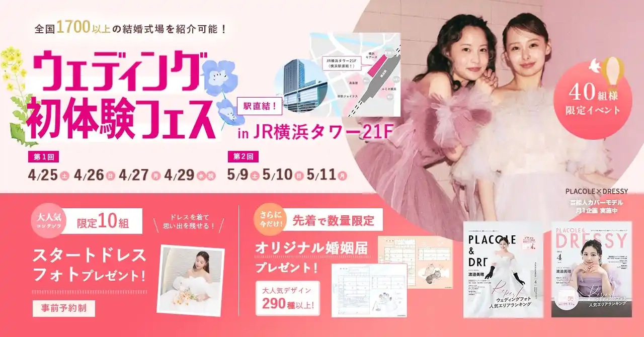 | 「PLACOLE & DRESSY」ブランドを展開する冒険社プラコレ(本社:神奈川県鎌倉市、代表取締役CEO:武藤功樹)は、横浜駅直結JR横浜タワー21F、ウェディングの魔法にかかる空間"DRESSY ROOM YOKOHAMA"にて、4/25(土)~4/27(月)4/29(祝)限定で、これから結婚式をお考えのカップル様に向けた、個室相談やウェディングドレス試着ができる豪華特典付きのウェディング初体験フェスを開催いたします。(40組様限定、無料開催) | |||||||||