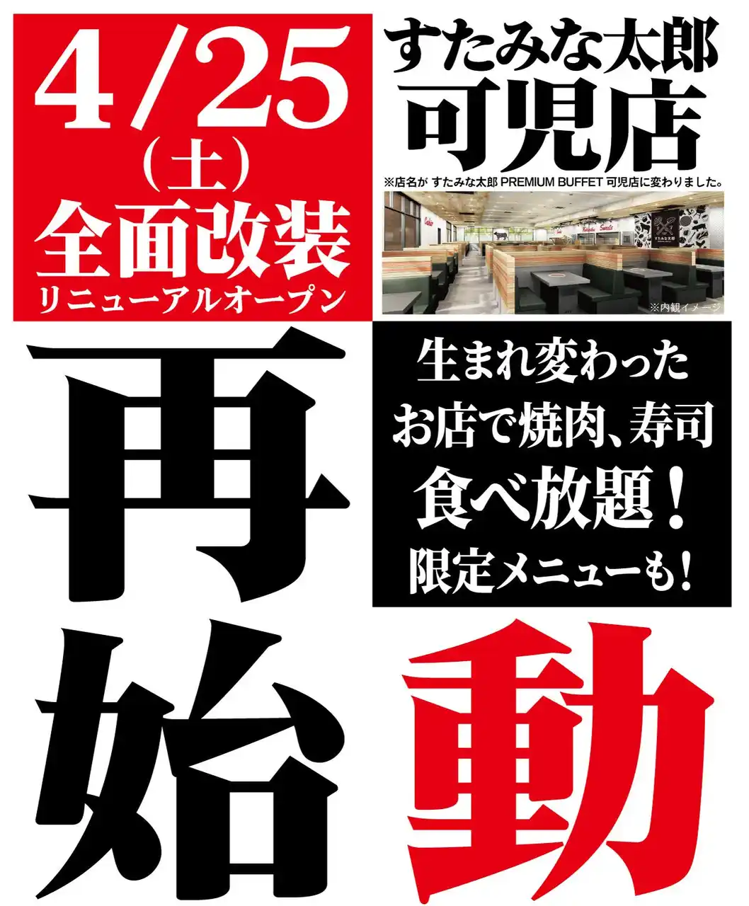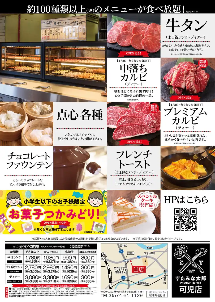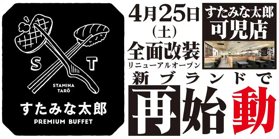 | 焼肉・寿司・スイーツ食べ放題レストランチェーンの「すたみな太郎」などを運営する株式会社江戸一(本社:東京都足立区、代表取締役社長:珊瑚 卓哉)は、岐阜県可児市の「すたみな太郎 可児店」を全面改装のうえ、2026年4月25日(土)に「すたみな太郎 PREMIUM BUFFET可児店」としてリニューアルオープンいたします。オープニング記念限定メニューも登場! | |||