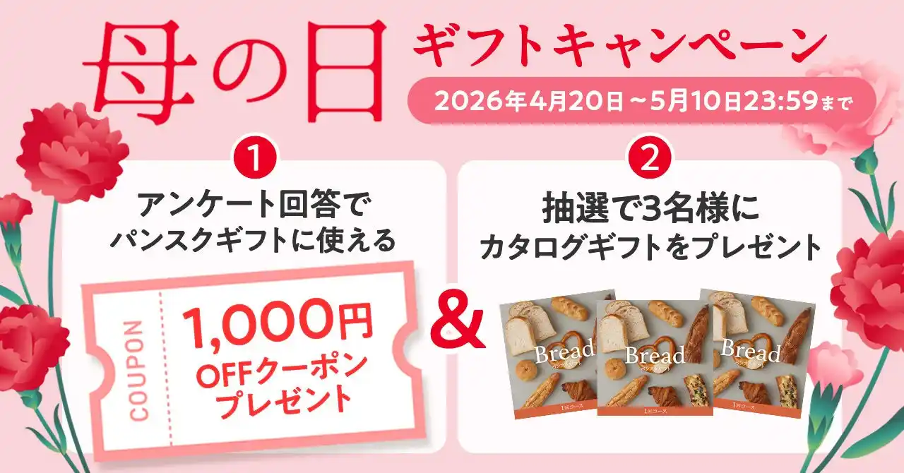 株式会社パンフォーユー(本社:群馬県桐生市、代表取締役:矢野健太)は、母の日に合わせて「母の日アンケートキャンペーン」を実施いたします。アンケートにお答えいただいた全員に、「パンスクギフト(https://gift.pansuku.com/)」で使える1,000円OFFクーポンをプレゼントします。 |