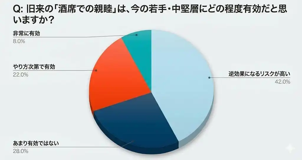| 「お酒を介さないと本音が話せない」という組織文化そのものに、今の世代は強い不信感を抱いています。良かれと思って開催した親睦会が、実は「負の資産」として、離職のリスクを高めている可能性があるのです。 | |||