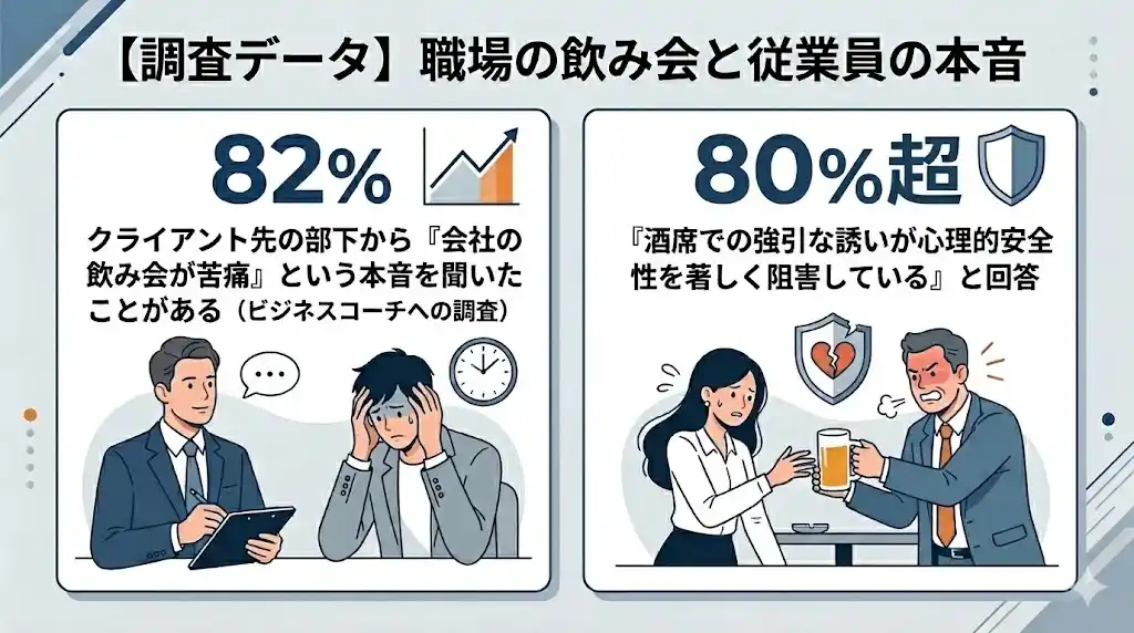 驚くことに、82%のコーチが部下にあたる層から「会社の飲み会が苦痛である」という本音を聞いています。 さらに同様に、8割超のコーチが、「酒席での強引な誘いが、職場の心理的安全性を著しく阻害している」と警鐘を鳴らしています |