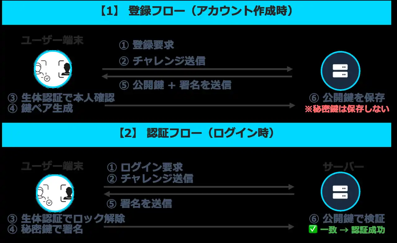 認証に必要な「秘密鍵」はユーザーのデバイス内にのみ保存され、ネットワークを通じて外部へ送信されることはありません。 |
