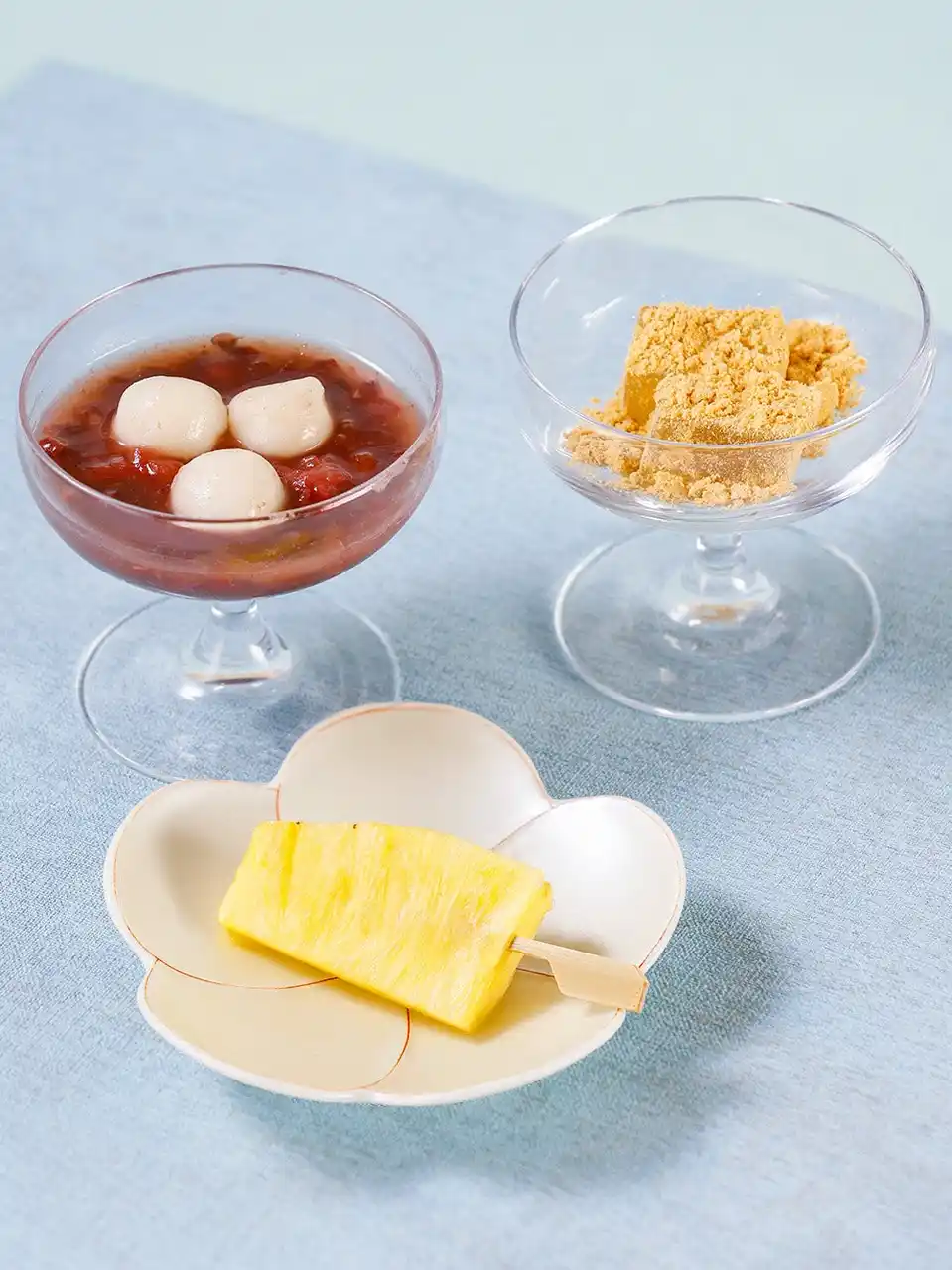 | 冷やしパインときなこわらび餅など三種類のスイーツ | |||||||||||||||||||