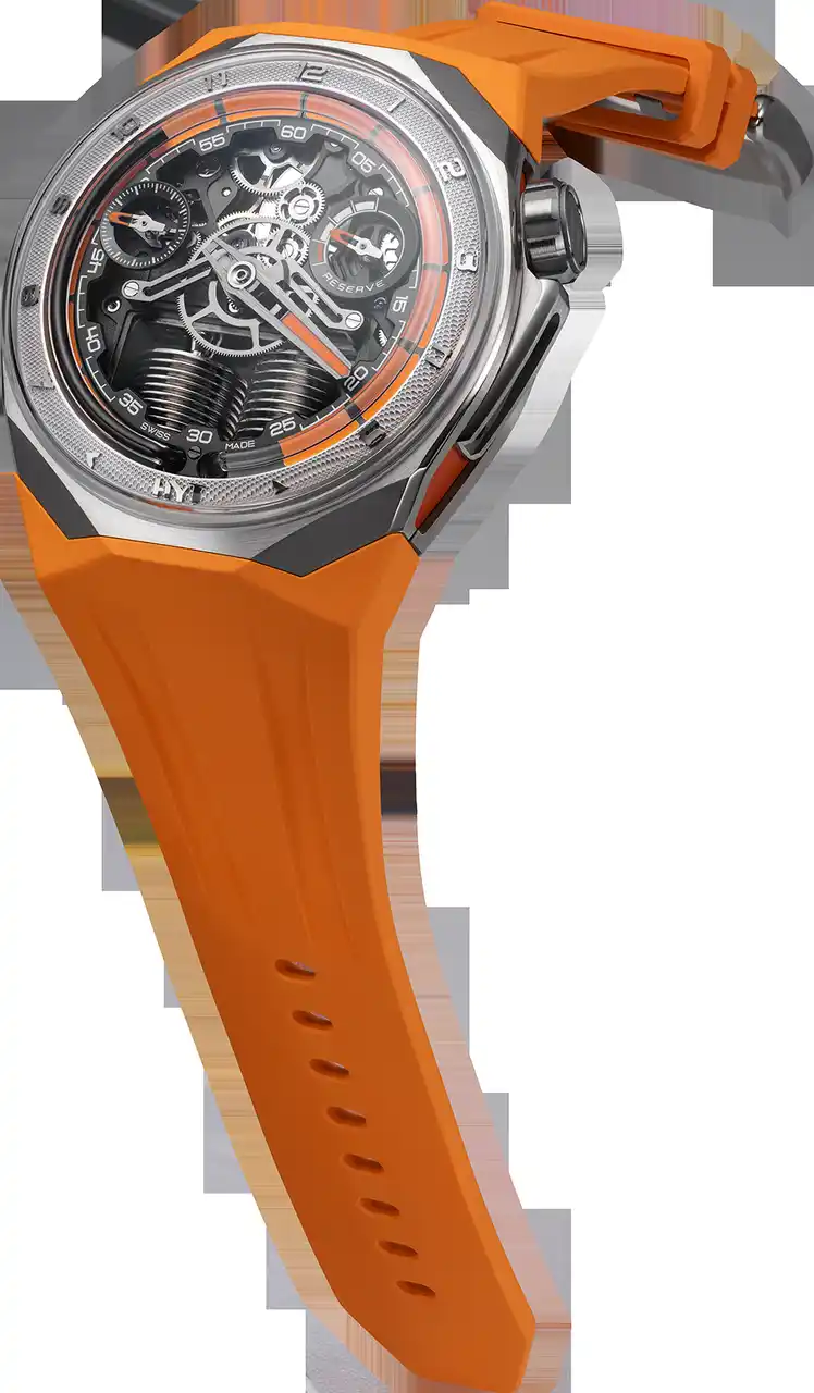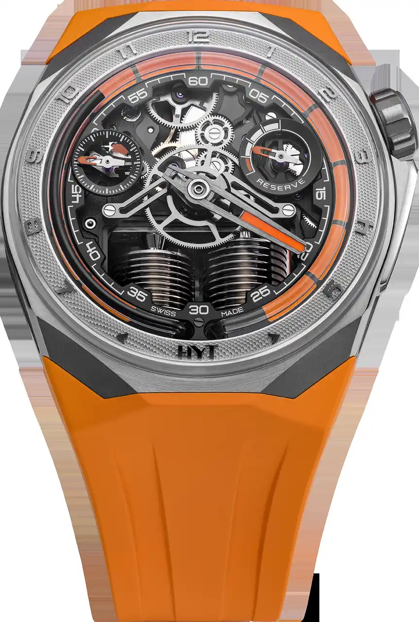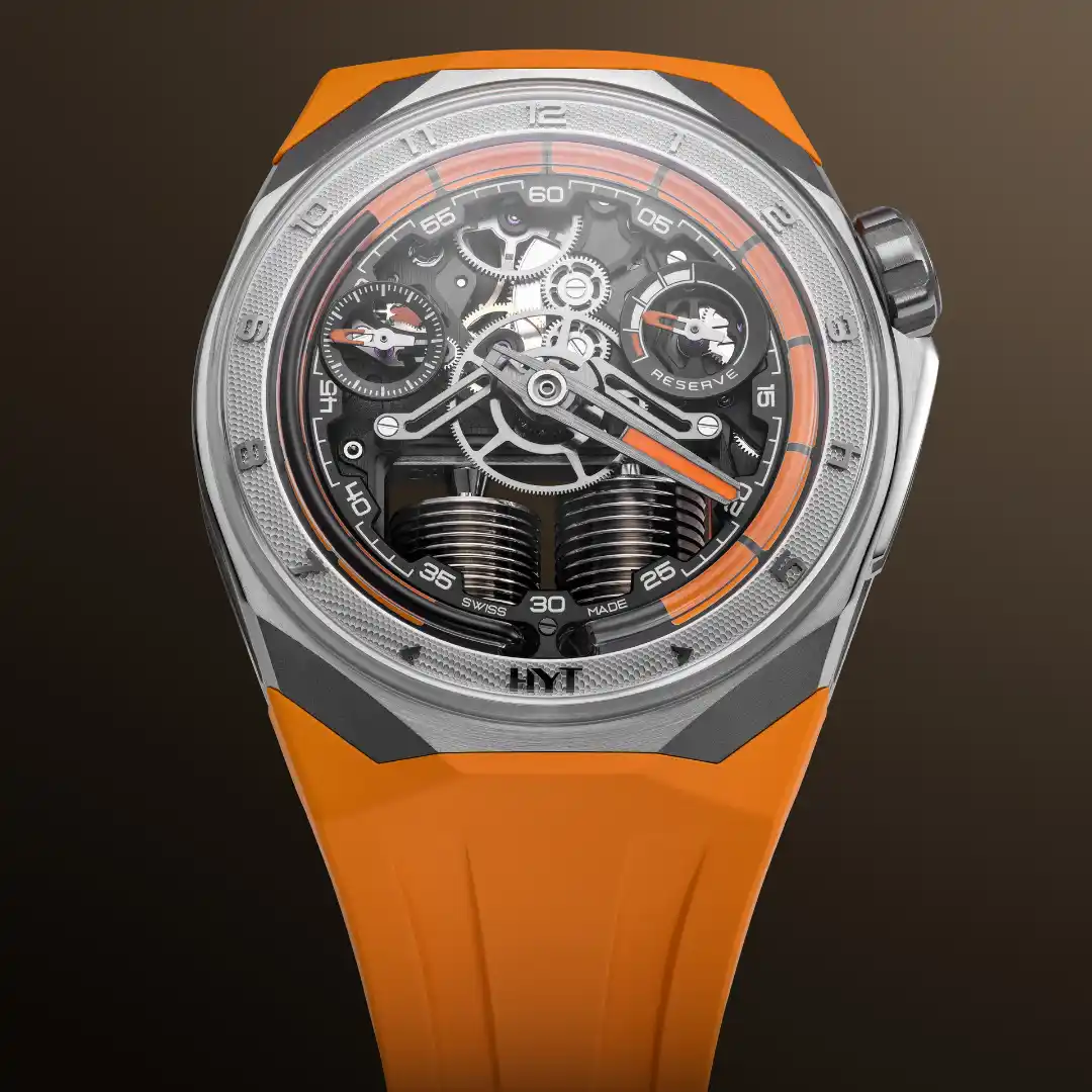 | オレンジは、スタートの合図となるライト、レーシングスーツ、そして突然夜へと移り変わる夕焼けの色です。HYTは、この色を新作「S1 チタン オレンジ」の輝きを放つ糸として表現しました。サテン仕上げのチタン製ケースは、銀色の金属と、文字盤の周囲を光るベルトのように囲むオレンジ色のDLCインサートとの間で、緊密な対話を繰り広げています。 | ||||||||||||||