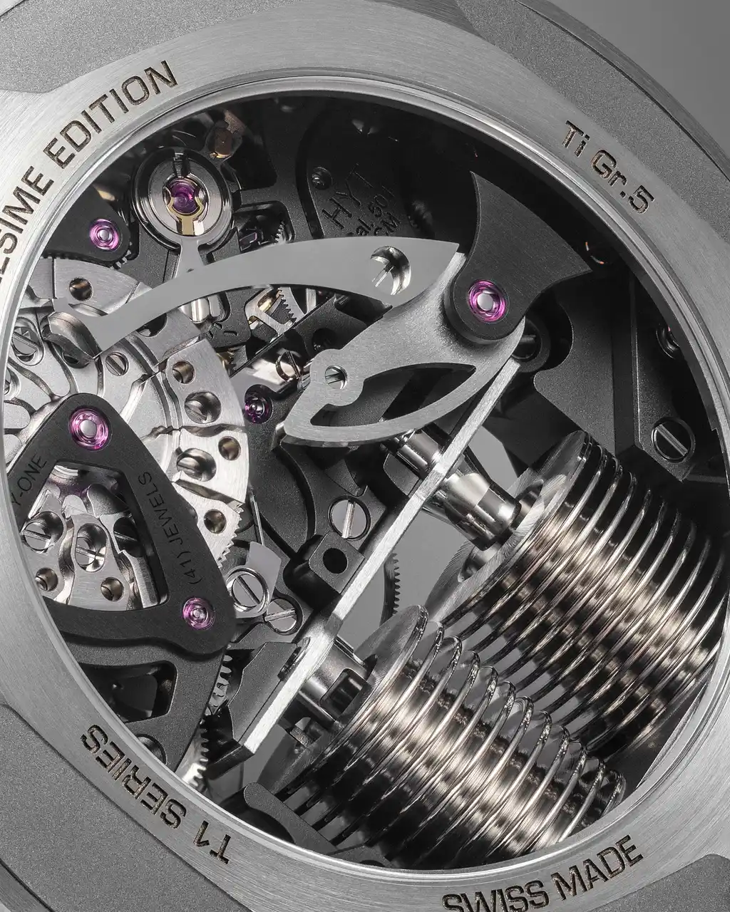 | 50m防水ケースに収められた501-CMムーブメントは、今なおHYTのハイドロメカニカル技術の象徴であり続けています。内径0.8mmのホウケイ酸ガラス製キャピラリー、そのメニスカスが逆行式時針として機能する2種類の非混和性液体、航空宇宙グレードのベローズ、そして温度変化下でも表示の精度を維持するための温度補償装置を備えています。文字盤を省くことで軽量化を図り、ムーブメントを視覚的な主役としています。ビーズブラスト加工とサテン仕上げを施したコンポーネントが、新たな2026カラーと調和しています。 | ||||||||||||||
