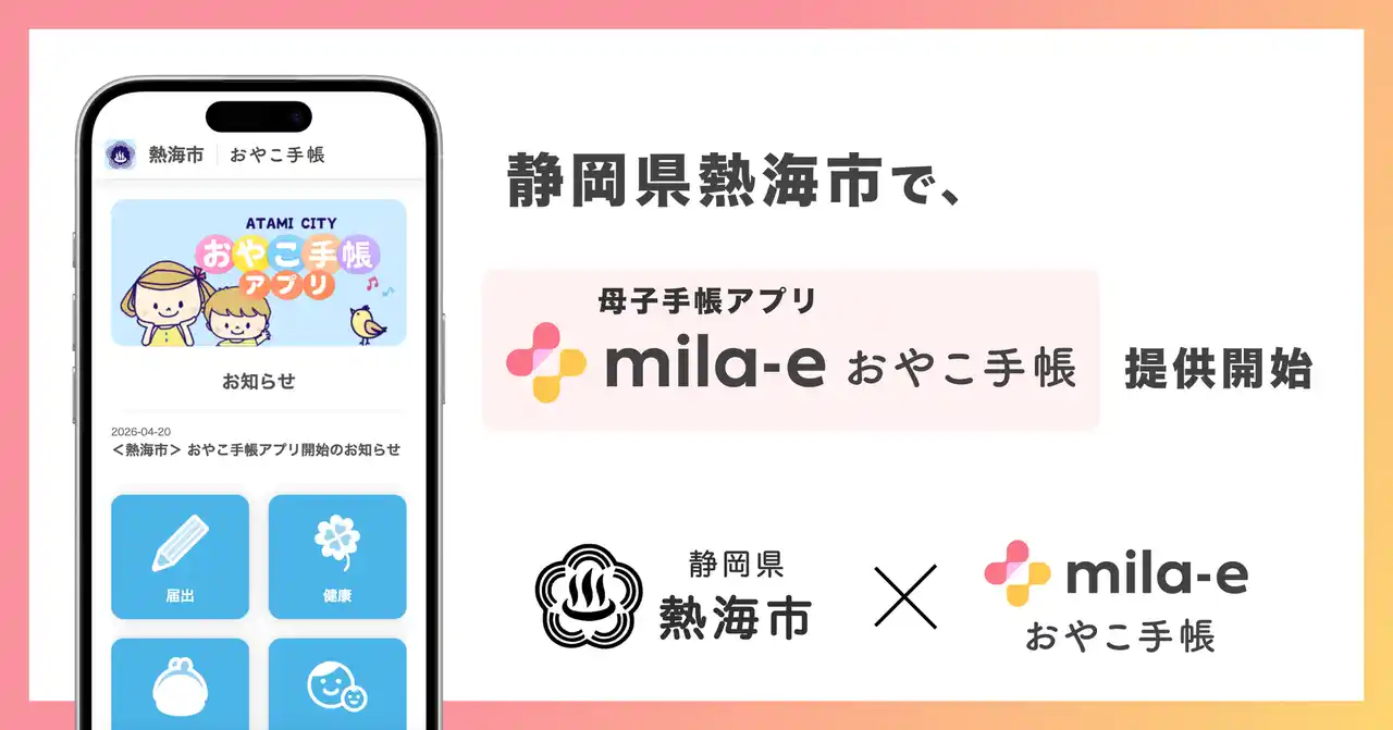 自治体向けサービスを開発する株式会社ミラボ(本社:東京都千代田区、代表取締役:谷川一也、以下「ミラボ」)の母子手帳アプリ「mila-e(ミライー) おやこ手帳」が、静岡県 熱海市に導入され、「熱海市おやこ手帳アプリ」として 2026年4月20日より提供を開始します。