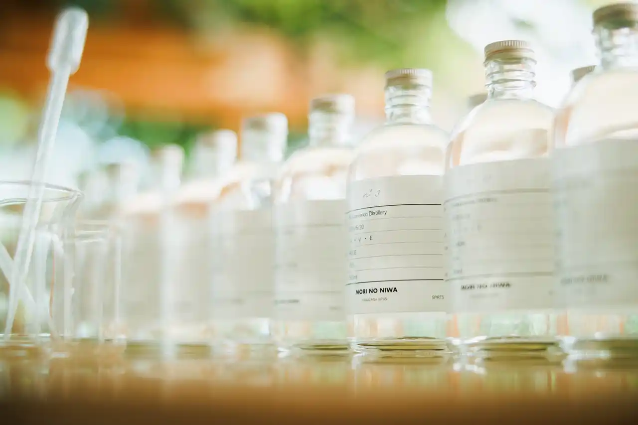 MORI NO NIWAでは素材ごとに香りを集めた蒸留酒を独自の呼称で「エレメント」と呼び、シグネチャーである「森のジン」は、それらをブレンドする「ブレンデッドジン」の手法をとっています。私たちにとってエレメントとは、その時々に出会った草花や素材が放ってくれた香りを閉じ込めた、いわば「命の記録」のような存在です。 |