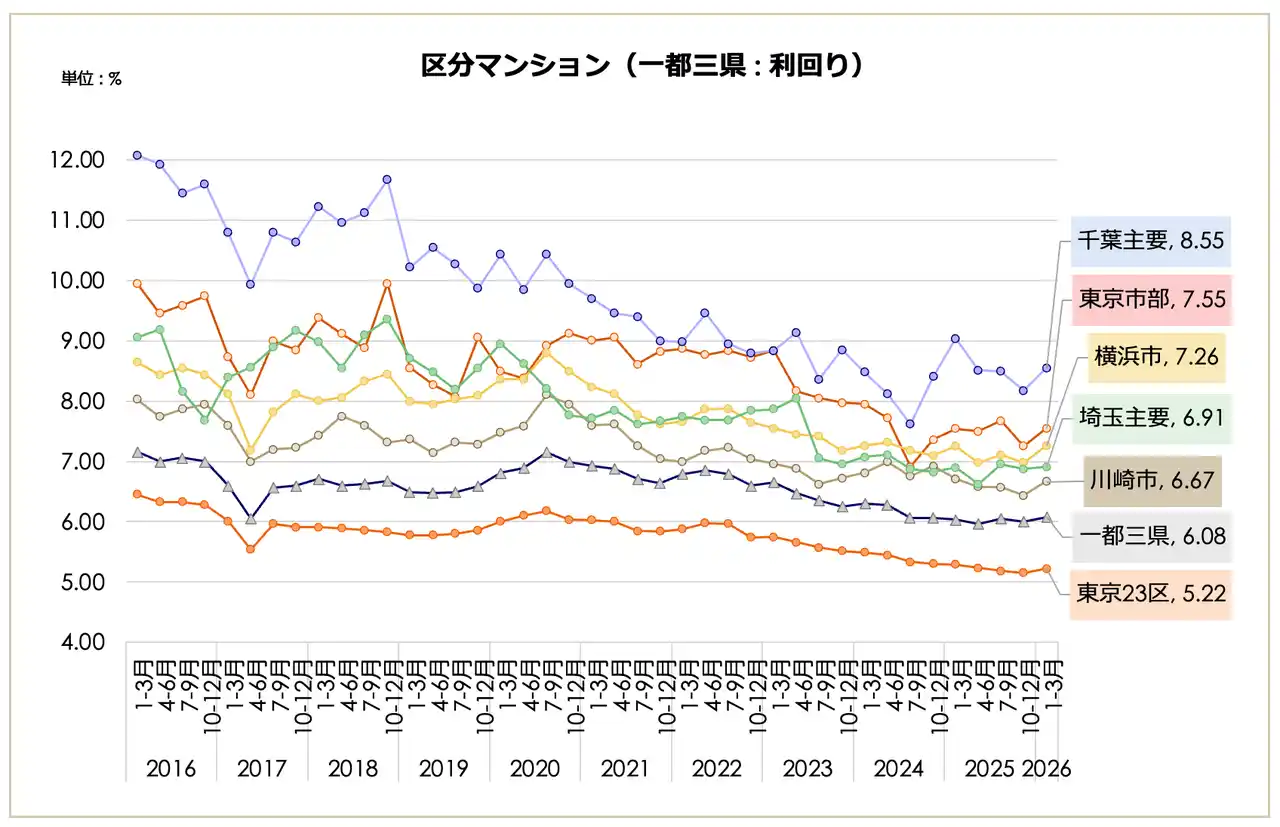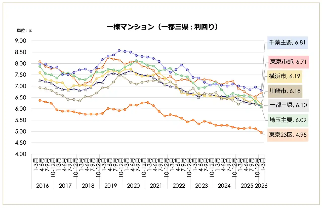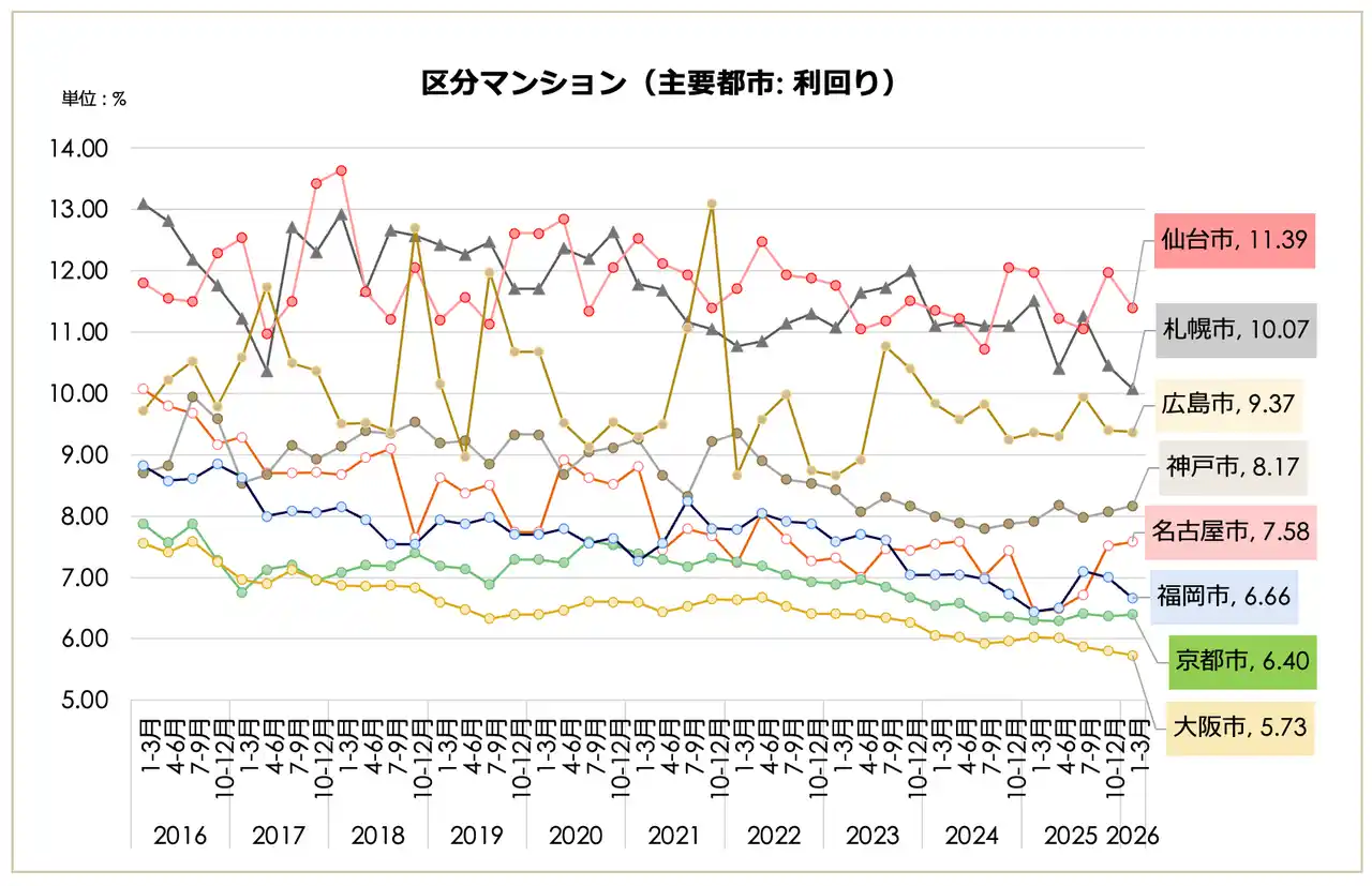 一都三県(3,007万円、前期比2.24%減)や東京23区(3,687万円、同1.76%減)が下落に転じたが、大阪市(2,115万円)や福岡市(1,508万円)などの主要都市では上昇トレンドを維持。一方で、23区の「築10年未満」利回りは3.74%まで低下し、依然として買い手の高値許容度は極めて高い状態にある。 |