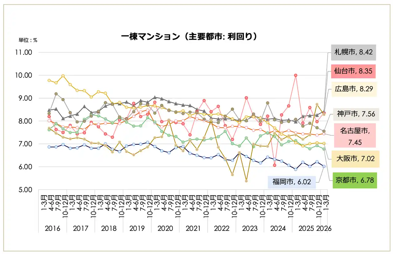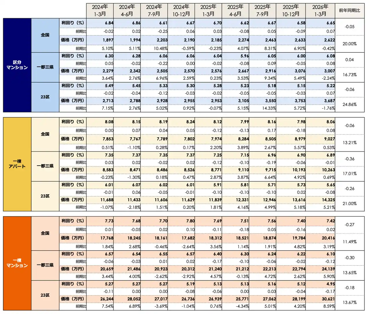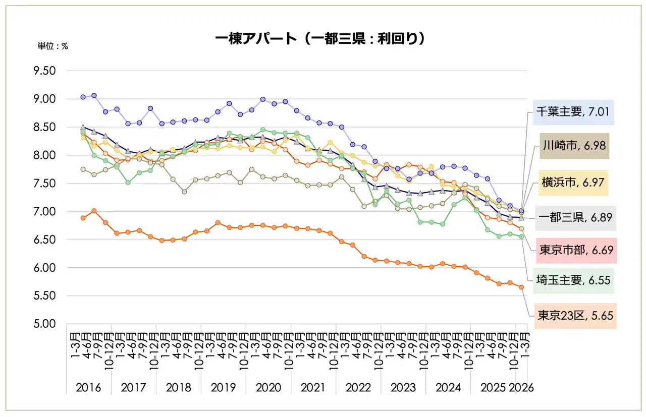 一都三県(3,007万円、前期比2.24%減)や東京23区(3,687万円、同1.76%減)が下落に転じたが、大阪市(2,115万円)や福岡市(1,508万円)などの主要都市では上昇トレンドを維持。一方で、23区の「築10年未満」利回りは3.74%まで低下し、依然として買い手の高値許容度は極めて高い状態にある。 |