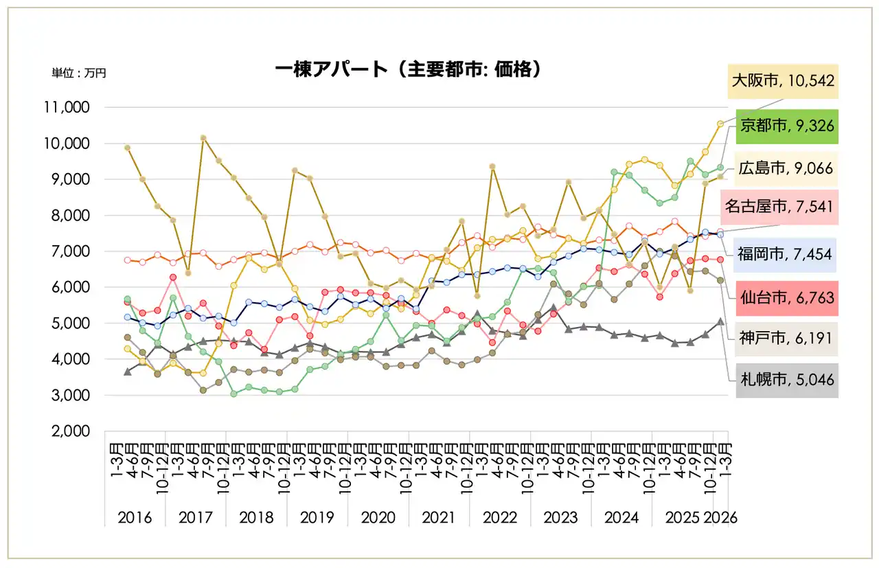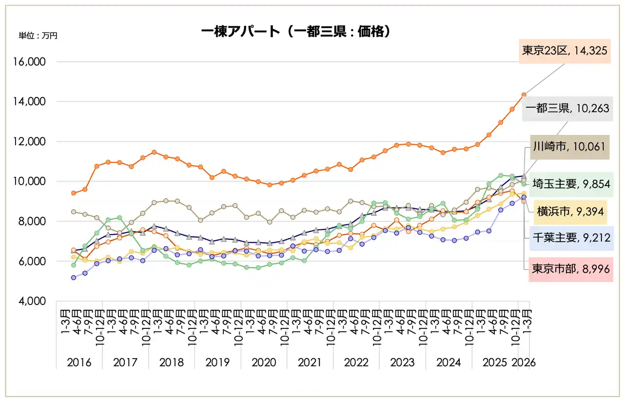 ◼️ 一棟アパート 全国平均価格は過去最高値を更新。東京23区が続伸し、大阪市も1億円の大台に |