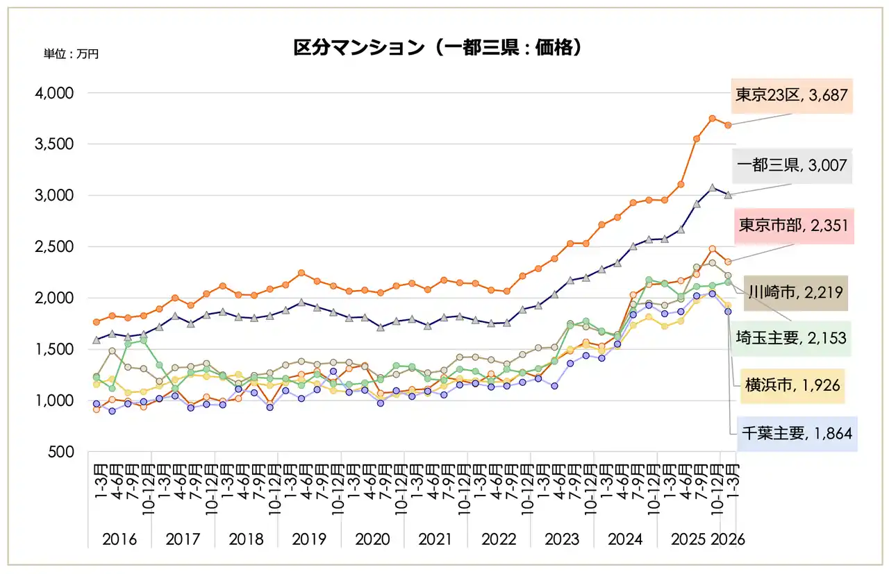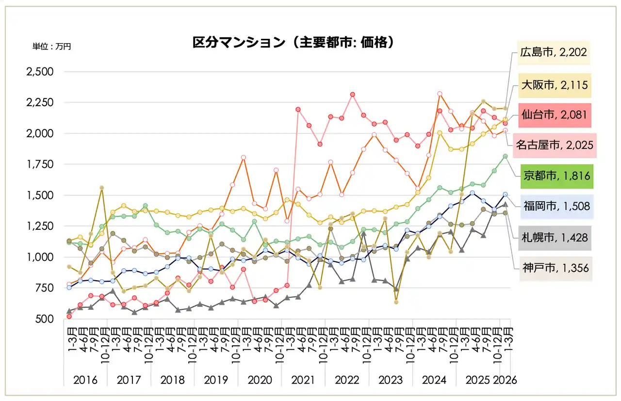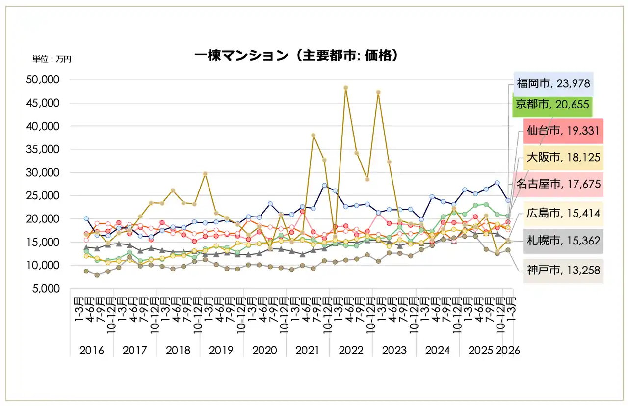 一都三県・主要都市別の動向を見ると、一都三県(3,007万円、前期比2.24%減)や東京23区(3,687万円、同1.76%減)が下落に転じた一方で、主要地方都市は上昇を見せています。大阪市(2,115万円)、京都市(1,816万円)、福岡市(1,508万円)などは上昇トレンドを維持しており、一都三県・23区の下落と地方主要都市の上昇で動きが分かれる結果となりました。 |