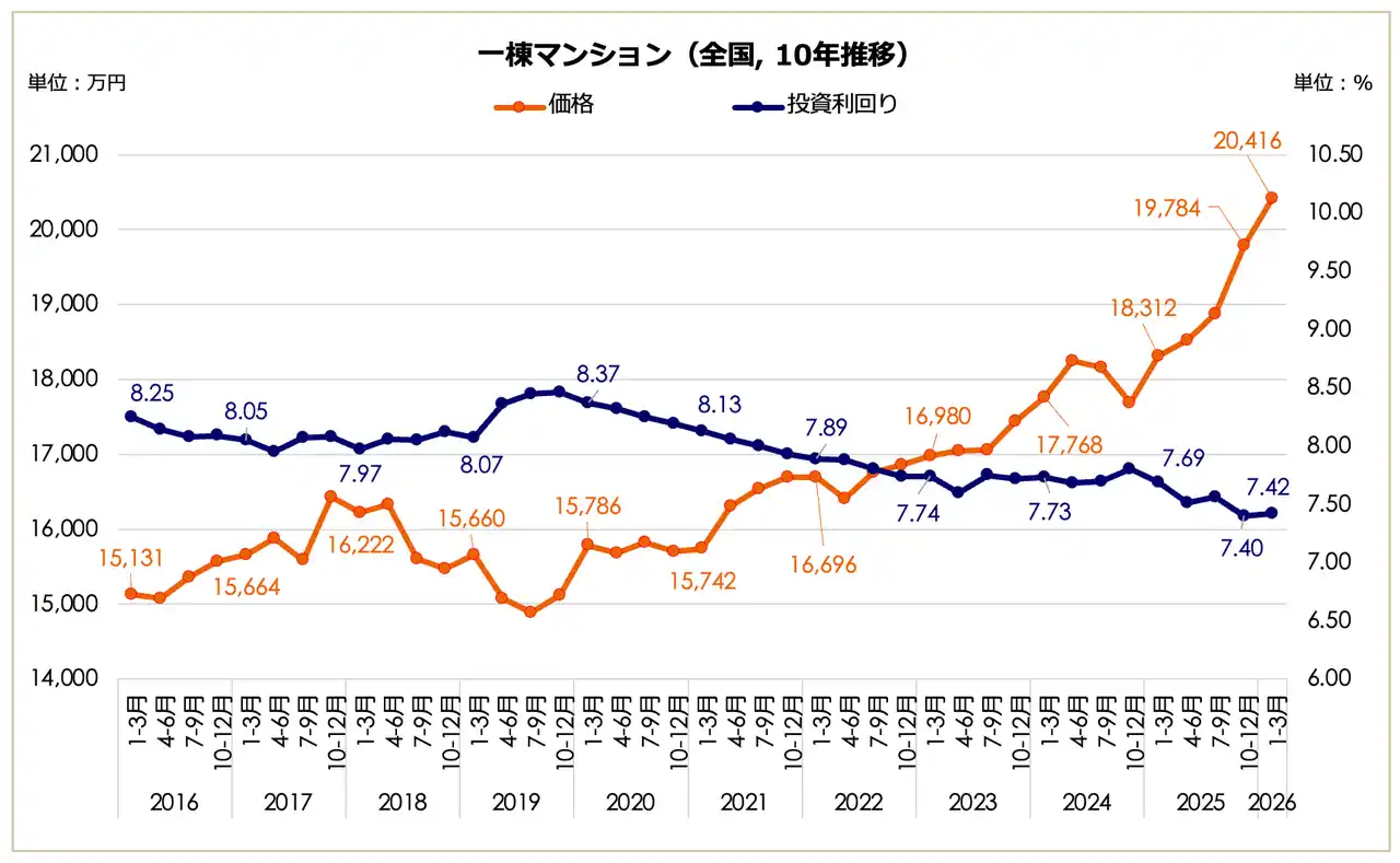 2026年1月~3月期における全国の一棟マンション価格は2億416万円となり、前期(1億9,784万円)から上昇して2億円の大台に乗り、前年同期(1億8,312万円)と比較しても11.49%の価格増となっています。表面利回りは7.42%となり、前期(7.40%)から0.02ポイントの微増となったものの、前年同期(7.69%)を下回る低水準での推移が継続しています。 |