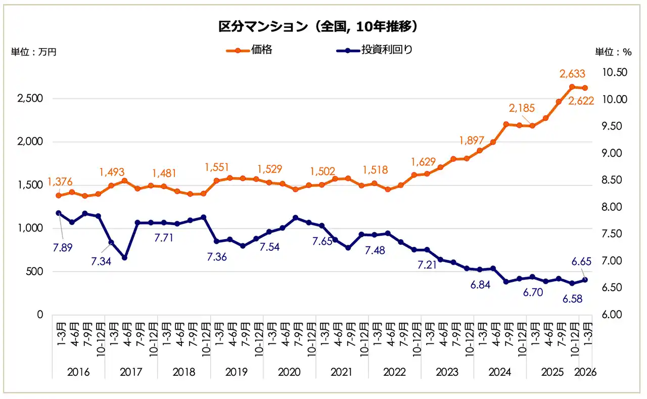 2026年1月~3月期における全国の区分マンション価格は2,622万円となり、前期比で0.42%減少しました。微減となったものの、10年前(2016年1-3月期:1,376万円)の約1.9倍にあたる高値圏を維持しています。表面利回りは6.65%(前期6.58%)となり、長期の低下傾向が止まり、横ばいでの推移となりました。 |