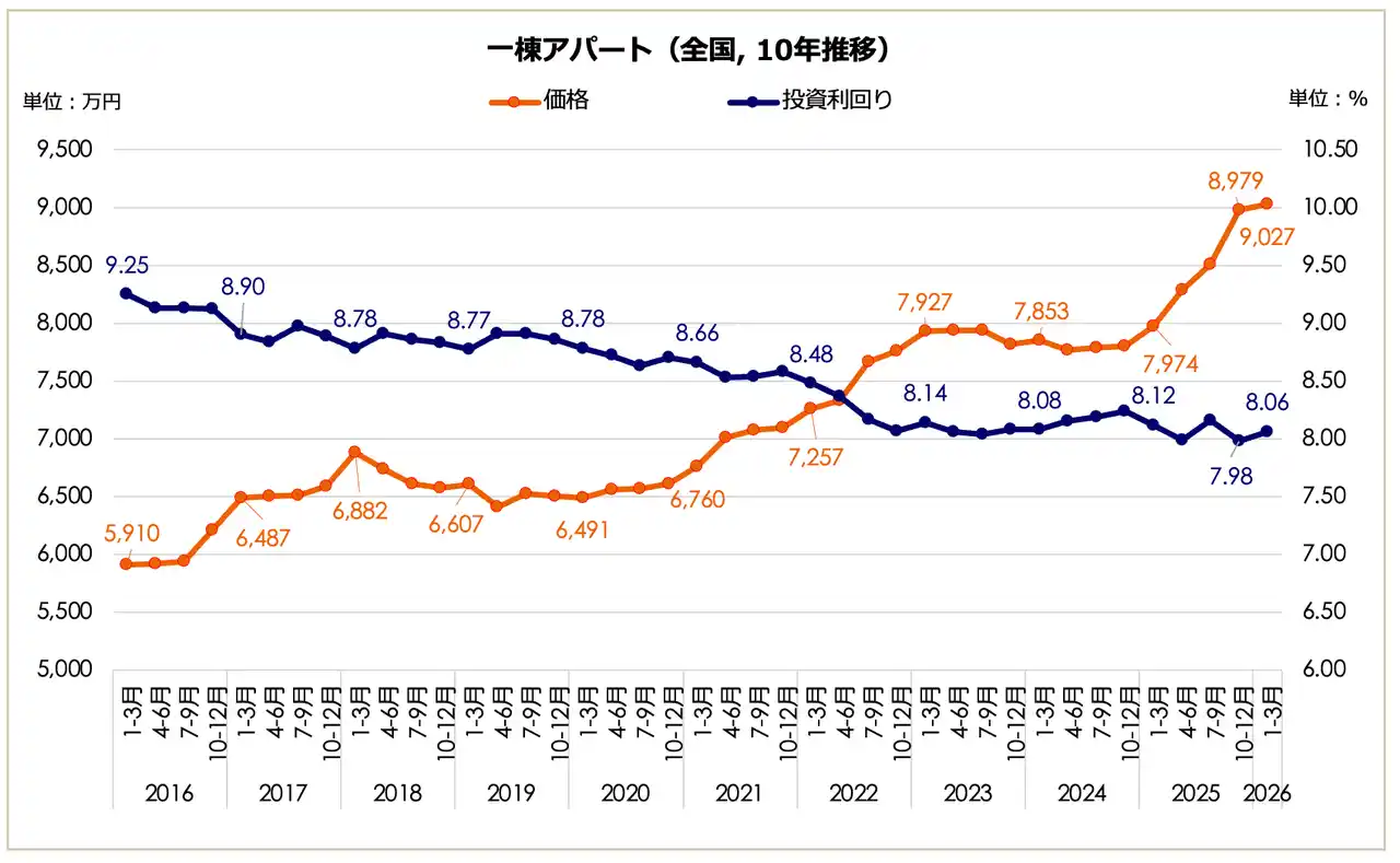 2026年1月~3月期における全国の一棟アパート価格は9,027万円となり、前期比で0.53%上昇しました。上昇トレンドを維持したまま、10年前(2016年1-3月期:5,910万円)の約1.53倍となる過去最高値を更新しています。表面利回りは8.06%となり、前期(7.98%)から0.08ポイントの微増となったものの、長期推移では依然として過去10年間で最低圏の低水準にあります。 |