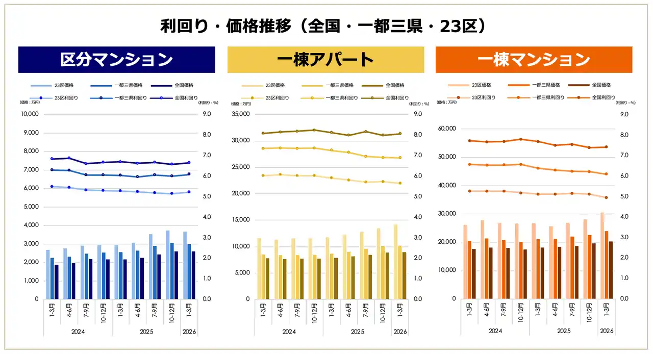2026年1月1日~3月31日に健美家で登録された全国の住宅系収益不動産3種別(区分マンション・一棟アパート・一棟マンション) |