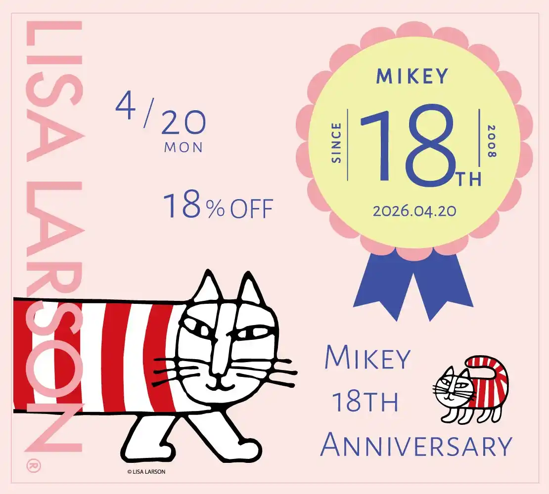 | 株式会社トンカチ(東京都目黒区、代表取締役:勝木悠香理)は、人気キャラクター「マイキー」の誕生18周年を記念し、2026年4月20日(月)24時間限定のバースデーセールを開催いたします。あわせて「KID BLUE」「Estacion」との特別なコラボレーションアイテムを発表いたします。 | |||||||||||||||||||