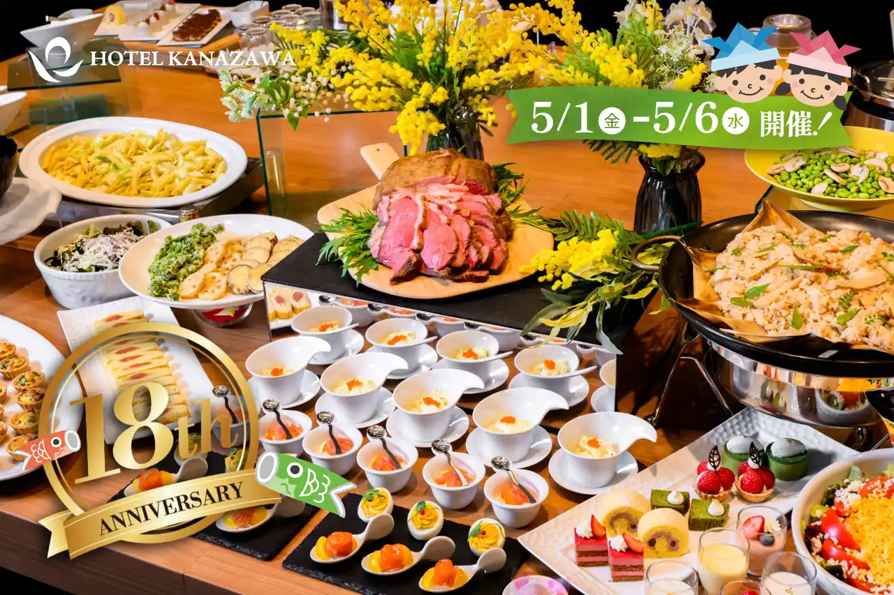 | 四季折々の素材にこだわった料理を提供する株式会社ホテル金沢(所在地:石川県金沢市堀川新町1-1、総支配人:小嶋 一夫、以下「ホテル金沢」)は、2026年5月1日に開業18周年を迎えます。これを記念し、2026年5月1日(金)から5月6日(水・祝)のゴールデンウィーク期間中 、1階レストラン「DINING TSUZUMI」にて、大人1名様につき小学生以下のお子様2名様までが無料となる特別キャンペーン「GWランチブッフェ・ファミリー感謝祭」を実施いたします 。 | ||||||||||||||||