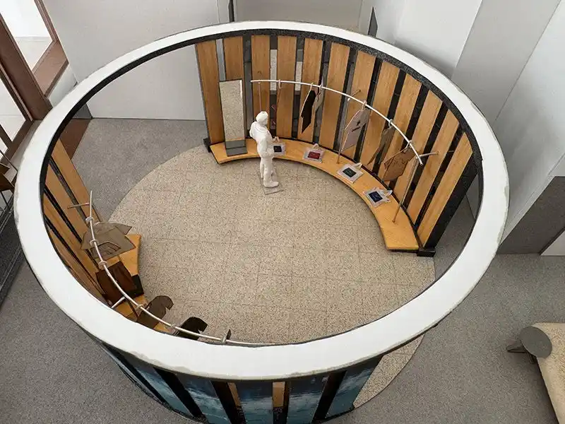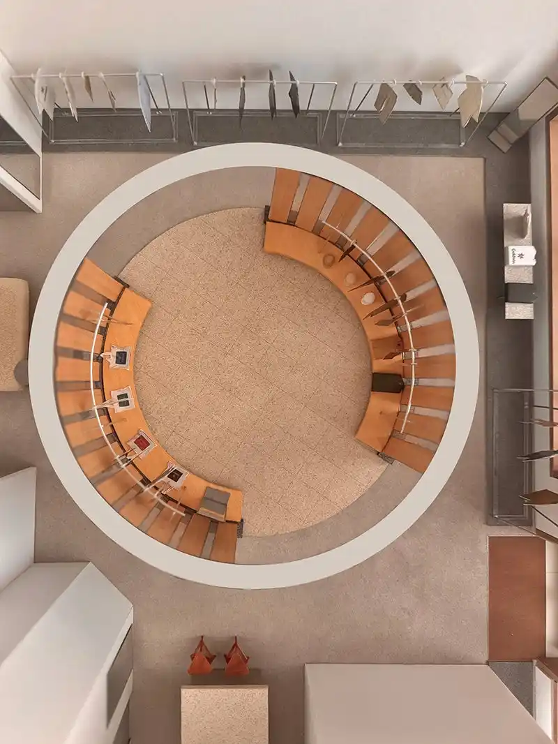 この空間の核となるのは、ガラスのファサードに面して中央に構えた環状の「社(やしろ)」です。ここはGoldwinのスタイルや理念を世界へ発信するステージであり、訪れる人々を物語の中心へと誘います。その外周には、時代を超えて愛されるスタンダードな商品を静かに配置し、空間のすべてが街ゆく人々の目を惹きつける一つの壮大なショーウィンドウとなるよう設計しました。 |