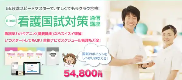 看護師になるために専門学校や大学で学んだ人が受験する「看護師国家試験」の合格に向けて、ポイントとなる知識を確認しつつ、過去問題演習などをスムーズに行えるようにするための通信講座です。