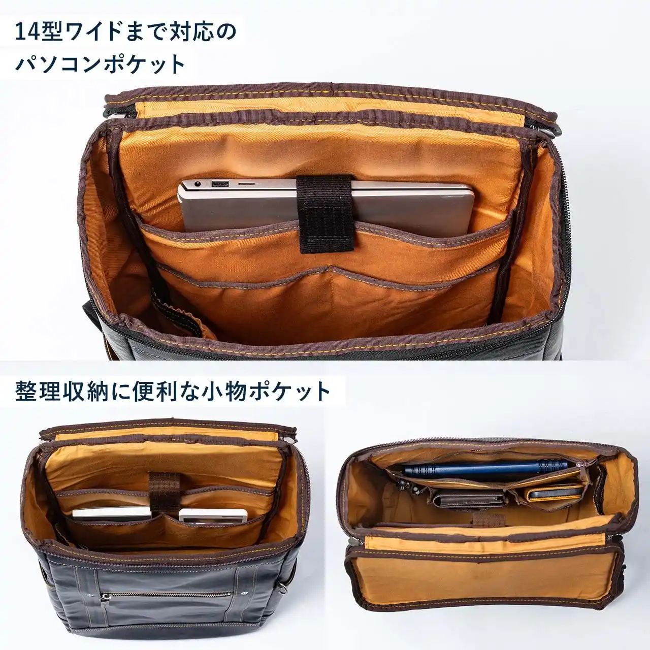 | メイン収納は斜めに大きく開く設計を採用しており、バッグの中身をひと目で確認しやすいのが特長です。さらに、内装には明るいオレンジ色を採用しているため、小物が埋もれにくく、必要なものを見つけやすくなっています。忙しい移動中や会議前でも、スマートに荷物を取り出せる使い勝手のよさが光ります。 | |||||||||