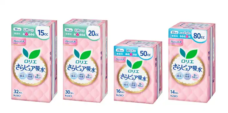 そこで、このたびの改良では、「ロリエ さらピュア吸水」の特長である、パワフル吸水、ニオイを瞬時に閉じ込める瞬間消臭、肌にやさしいやわらかエアリータッチはそのままに、接着力を向上*1。これにより、動いてもショーツとのズレを防ぎ、剥がれやすさを軽減。より快適なつけ心地を実現しました。ラインアップは、15cc、20cc、50cc、80ccの4つから吸収量に合わせてお選びいただけます。 |