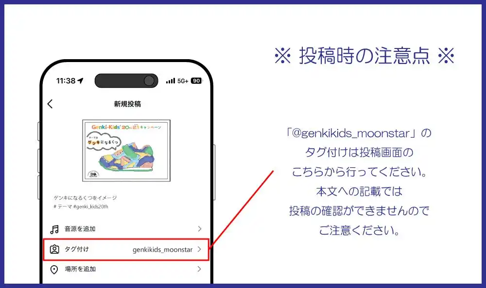 ・Instagramにて、Genki-Kids公式アカウントをフォローおよび、「@genkikids_moonstar」を画像にタグ付けし「#genki_kids20th」をテキストに記入しご投稿ください。 |
