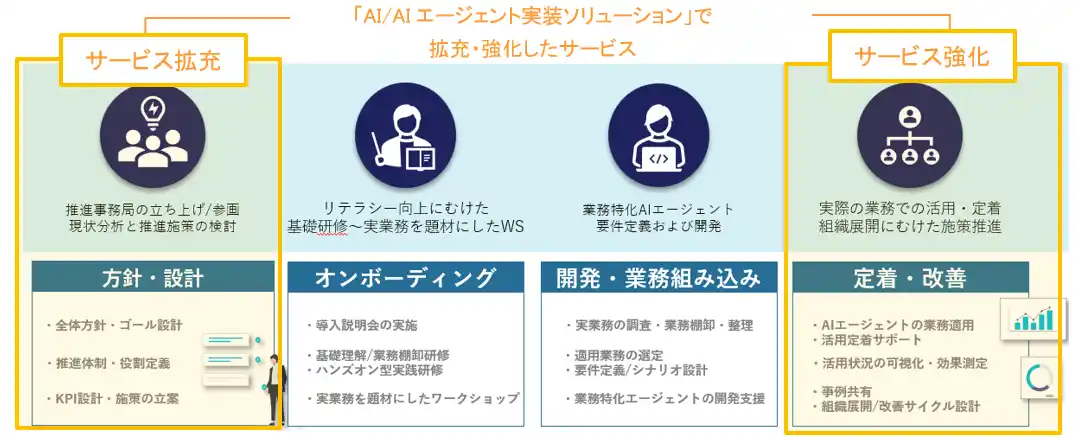 本サービスは、「方針・設計」から「オンボーディング」「開発・業務組み込み」「定着・改善」までを一気通貫で支援します。またMicrosoft 365 Copilot およびCopilot StudioをはじめとしたAI/AIエージェントを駆使したビジネス変革を支援します。 |