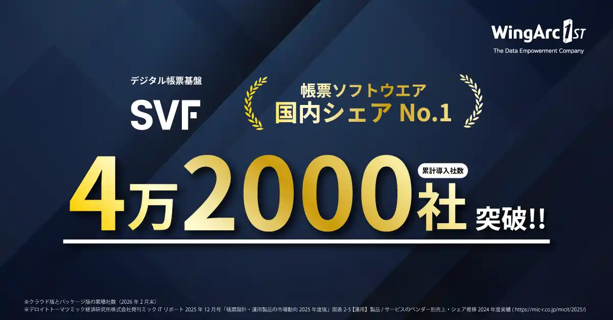 ウイングアーク1st株式会社(本社:東京都港区、代表取締役 社長執行役員CEO:田中 潤)は、帳票市場シェアNo.1(※1)のデジタル帳票基盤「SVF」の累計導入社数が4万2000社(※2)を突破したことをお知らせします。 |