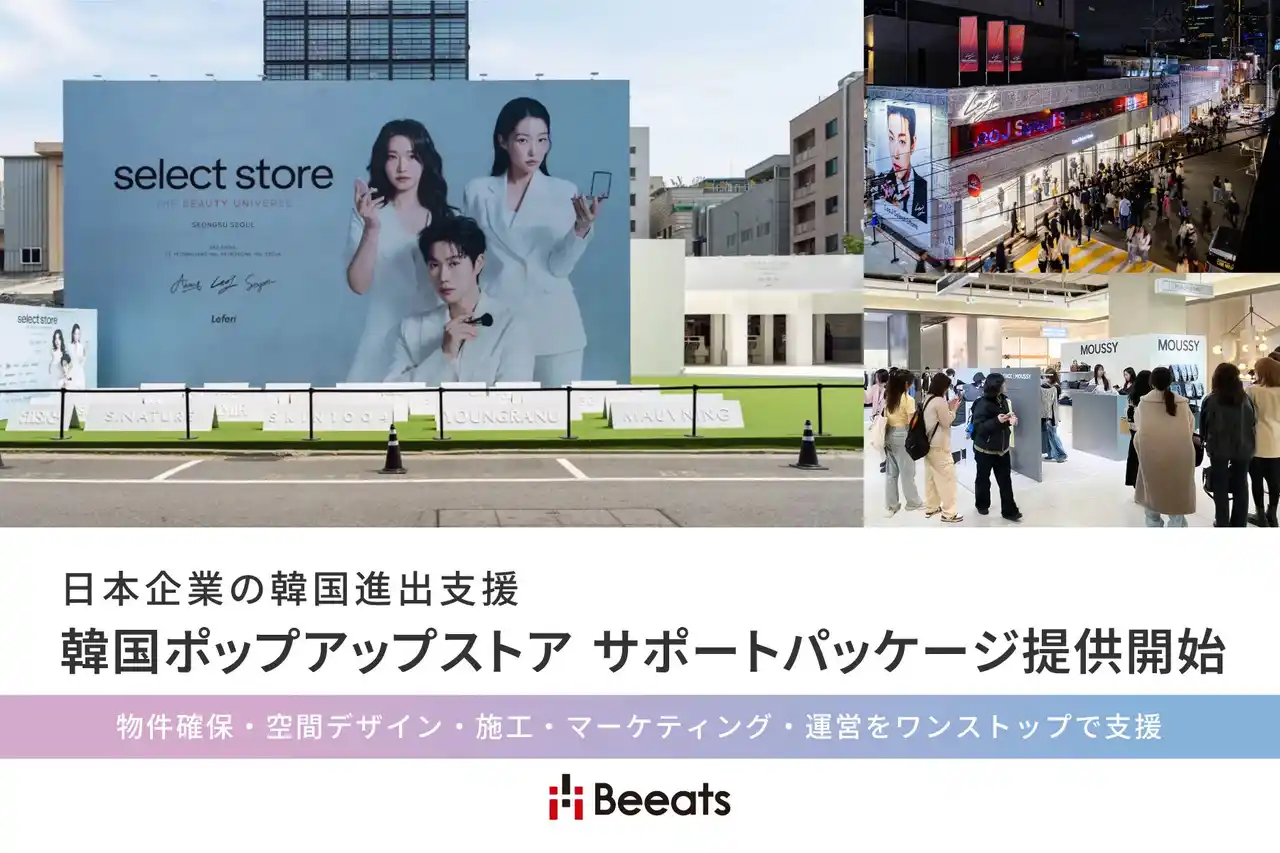 | リテール領域のブランド体験を共創する株式会社ビーツ(代表取締役社長:柏木又浩、大阪府大阪市中央区、以下「ビーツ」)は、韓国市場への進出を目指す日本企業を対象に、ソウル・聖水(ソンス)エリア等におけるポップアップストアの「物件確保・空間デザイン・施工・マーケティング・運営」をワンストップで支援するパッケージの提供を開始いたします。 | |||