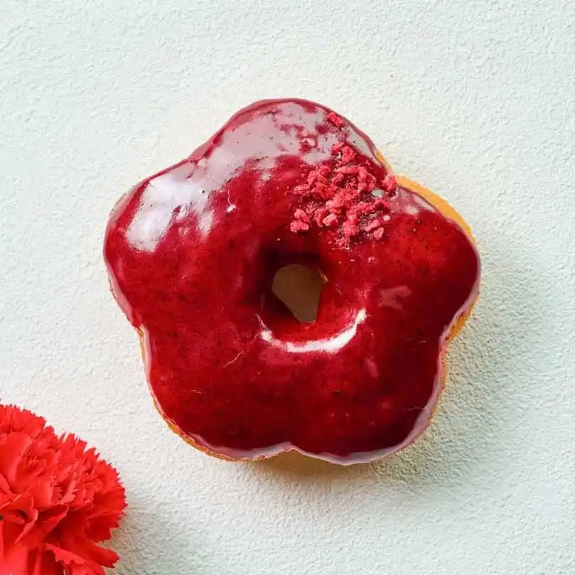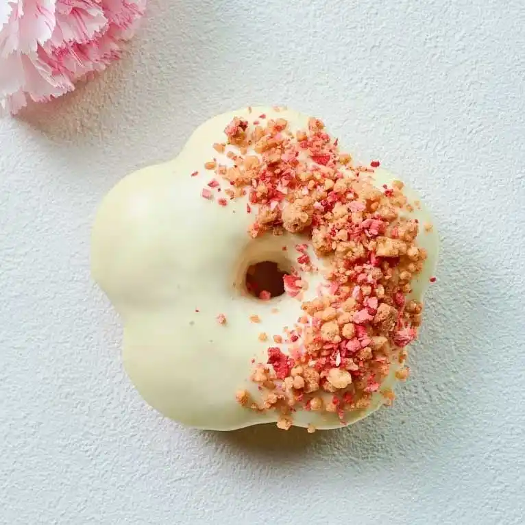 フランボワーズグレーズをまとったドーナツに、ドライフランボワーズとホワイトクランチをトッピング。ピンクの色合いと素材の組み合わせが目を引く一品です。 |