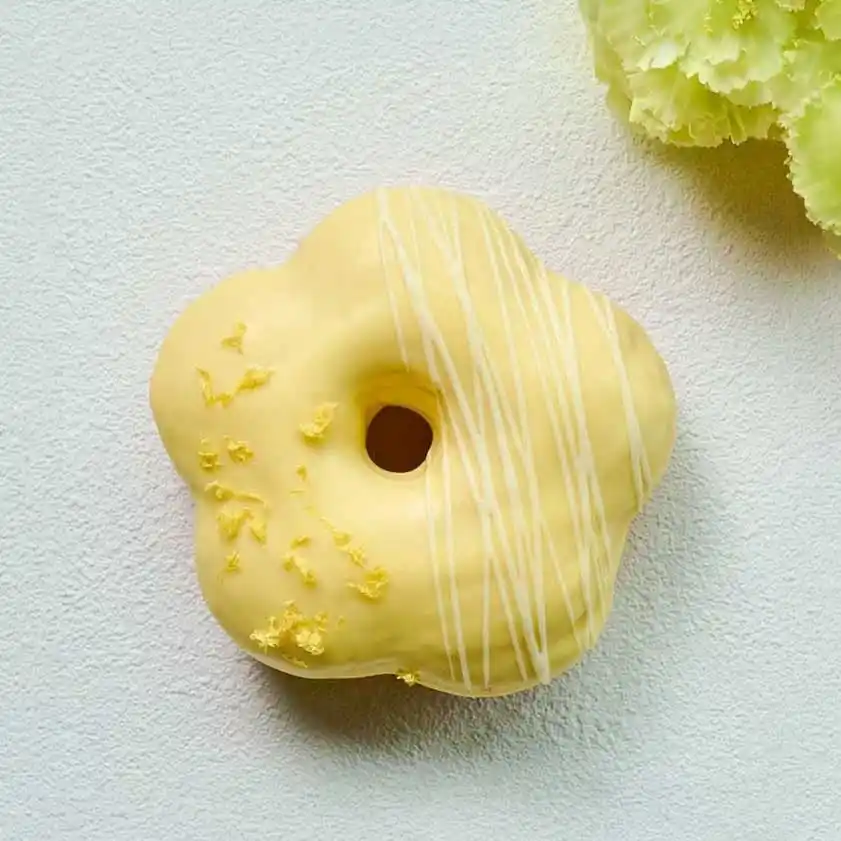 花形のブリオッシュ生地のドーナツにレモンチョコレートをコーティングし、レモンピールとホワイトチョコレートでデコレーションしました。やわらかなカラーが可愛く、レモンの風味がほのかに感じられる仕上がりです。 |