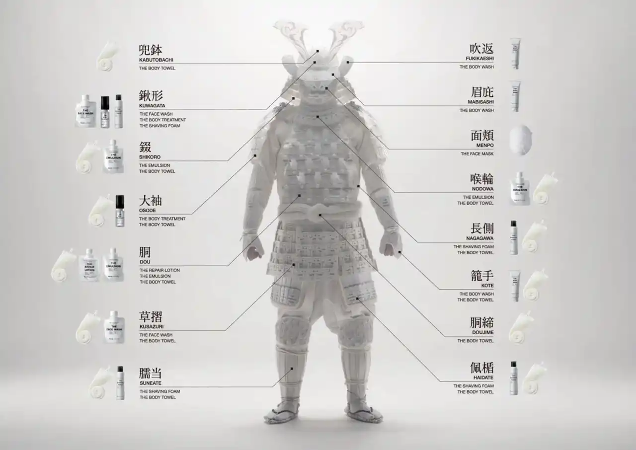細部に至るまで、BULK HOMMEの象徴的なパウチ容器やボトルデザインを伝統的な甲冑の構造に落とし込みました。 |