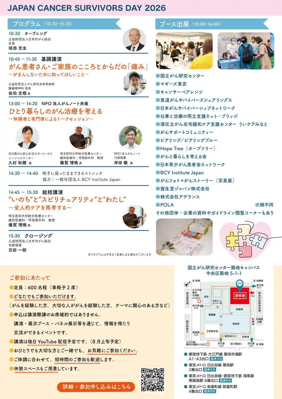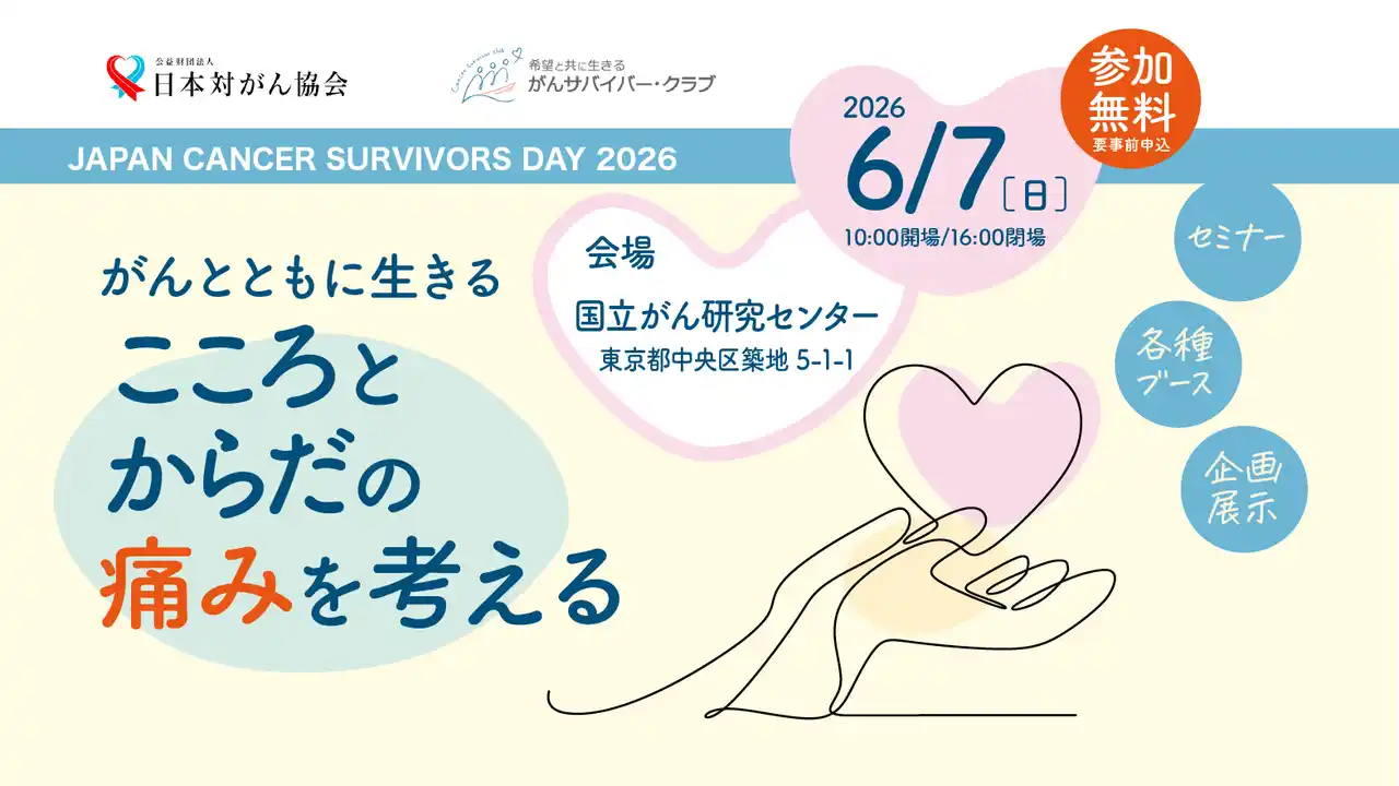 | 公益財団法人日本対がん協会は、がん患者・家族のみなさまに、がん治療や療養生活に関する情報をお届けするイベント「JAPAN CANCER SURVIVORS DAY 2026(ジャパン キャンサー サバイバーズ デイ)」を開催いたします。 | |||||||||