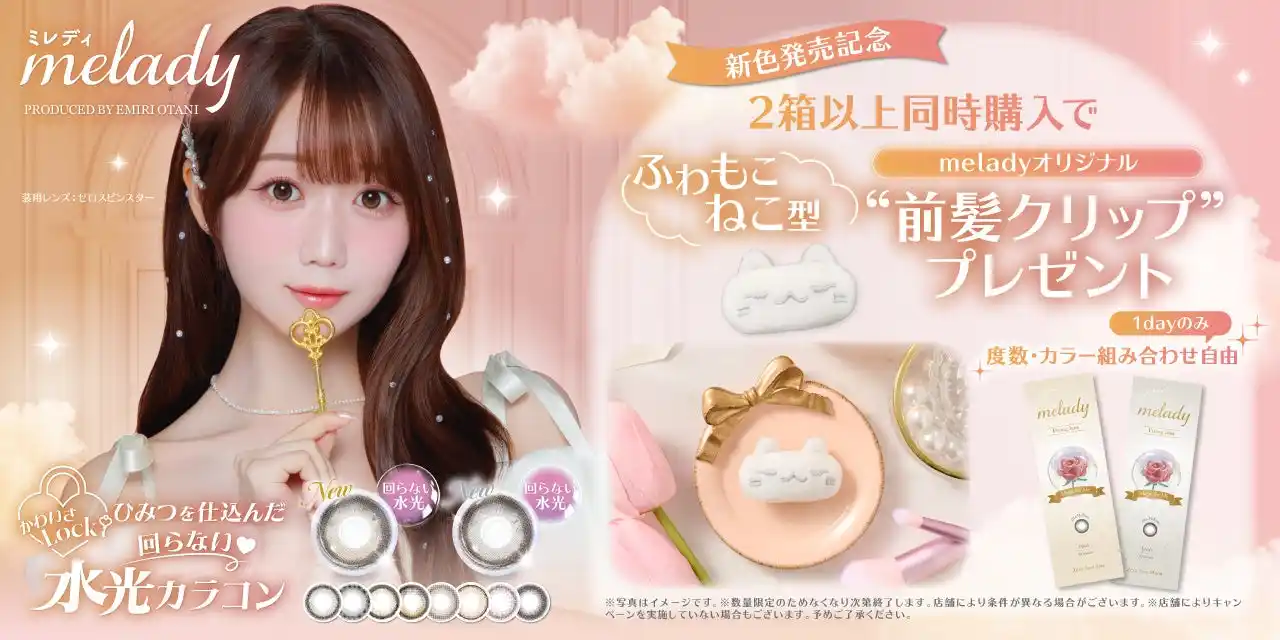 PIA株式会社(本社:東京都品川区 代表取締役:見原 博道)は、今大注目の人気アイドルグループ「=LOVE」のメンバーであり、モデルやアパレルブランドのプロデューサーとしても多岐にわたり活動中である大谷映美里さんプロデュースのカラーコンタクトレンズブランド『melady(ミレディ)』より、新色2色を2026年5月8日(金)に発売いたします。 |