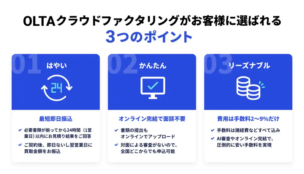 | ファクタリングとは、企業が商取引で発生した「入金待ちの請求書」を売却して、早期に運転資金を調達する手法です。OLTAは、2017年に日本初のオンライン型ファクタリングである「OLTAクラウドファクタリング」の提供を開始したパイオニア企業です。AIを活用した審査などにより「はやい・かんたん・リーズナブル」なサービスを実現しています。 | |||