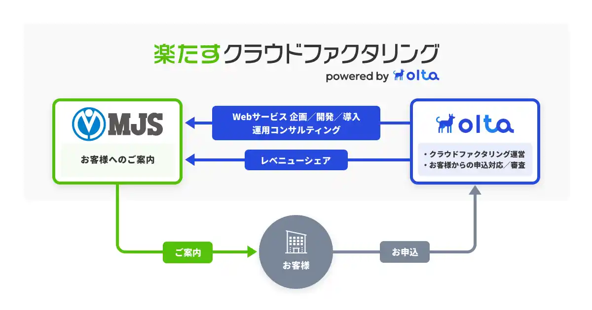 | 日本初※のオンライン型ファクタリングサービス「OLTAクラウドファクタリング」を提供するOLTA(オルタ)株式会社(代表取締役社長兼CEO:澤岻 優紀、以下「OLTA」)は、株式会社ミロク情報サービス(代表取締役社長:是枝 周樹、以下「MJS」)と提携し、2026年4月20日よりクラウドファクタリング事業「楽たすクラウドファクタリング powered by OLTA」の提供を開始します。 | |||