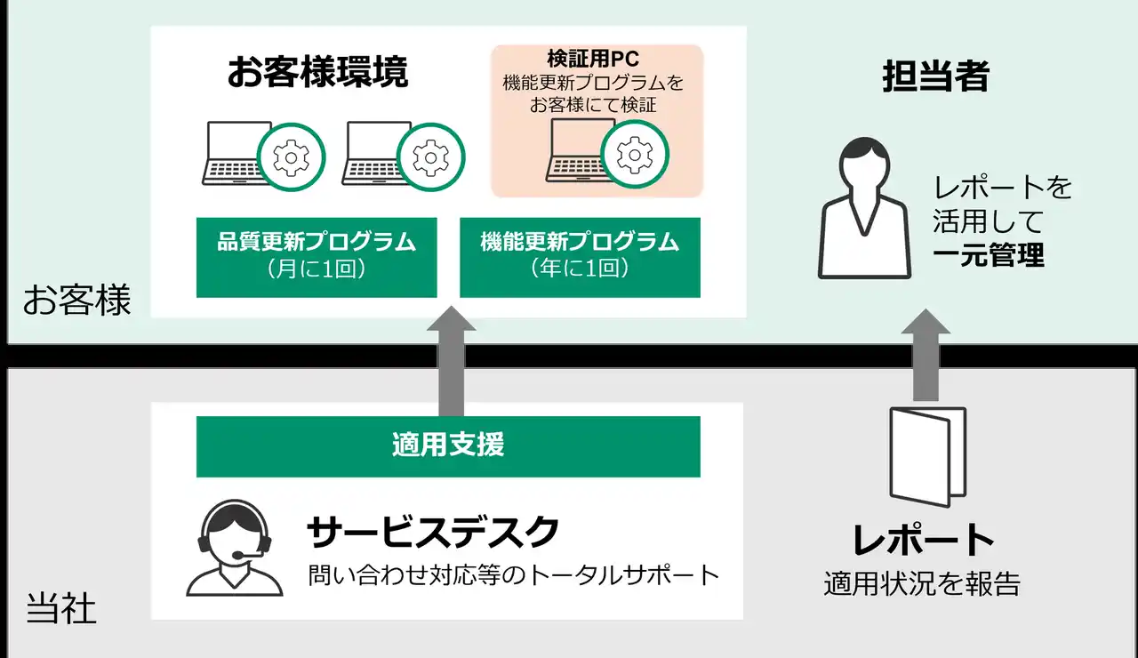 また、Windowsで年に1回実施される大型アップデート「機能更新プログラム」については、適用後に不具合が生じるリスクを抑えるため、お客様の環境で事前検証プロセスを設けることで、安心して運用を続けられる環境を維持します。 |