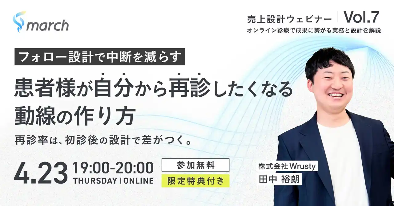 LINEを活用した集患と継続収益まで自動化することで、医療機関の “成果に責任を持つ” オンライン診療・集患オペレーションシステム「march」を展開する株式会社Wrusty(本社:東京都渋谷区、代表取締役:上田遼)は、全国の開業医・開業予定医の皆様を対象に、無料オンラインセミナー「~フォロー設計で中断を減らす~患者様が自分から再診したくなる導線の作り方」を2026年4月23日に開催いたします。本セミナーでは、中断を減らす診療後のフォロー設計を、成果に繋がっている医療機関の実例を交えて徹底解説します。また、なぜ「march」を活用している医療機関は1年間で9倍という収益に繋げることができているかを、再現性の高い設計という観点から解説します。