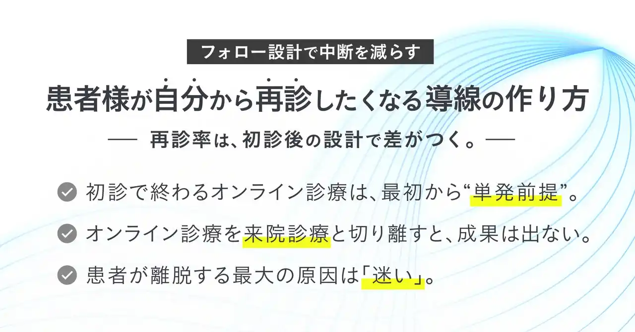 | その多くは、ツール選定や集患の問題ではなく、オンライン診療の“設計”そのものに原因があります。 | ||||||||||||||||||||||