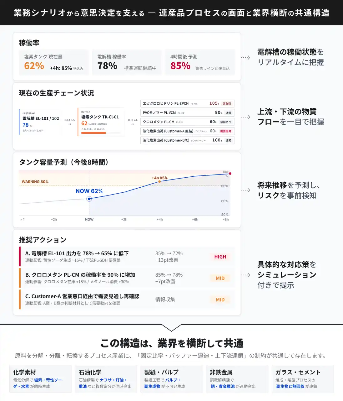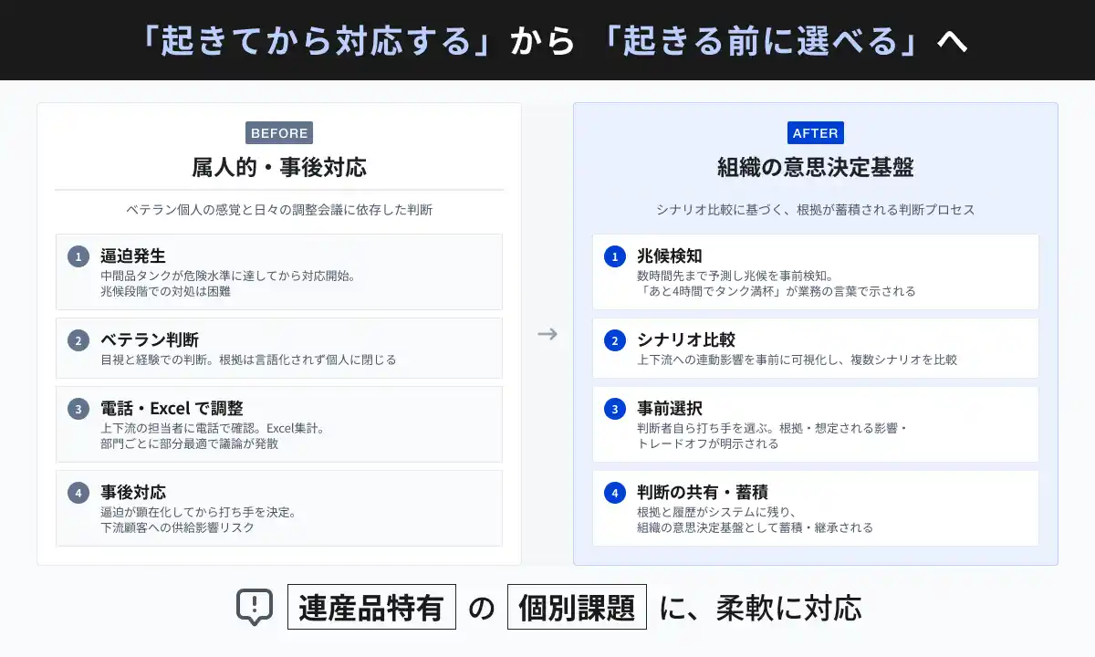 数式やグラフではなく、「あと4時間でタンク満杯」「下流Aへの供給を絞ると上流Bが2時間後に過剰生産」といった業務の言葉で状況を示し、複数のシナリオを事前に比較検討できる環境を構築します。判断者が自ら打ち手を「選べる」状態を作ることに注力しています。 |