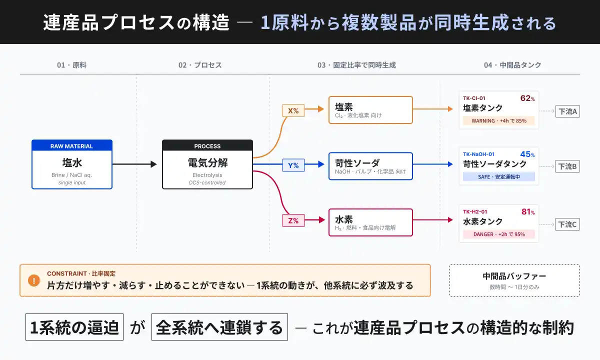 連産品プロセスを抱えるこれらの業界で、生産管理・工場DX推進のご担当者様であれば、この構造の難しさはあえて説明するまでもありません。固定比率で複数製品が同時に生成される制約、中間品バッファーの極めて小さい余裕、上流と下流の常時連鎖─これらは現場の皆様が日々直面されている現実です。 |