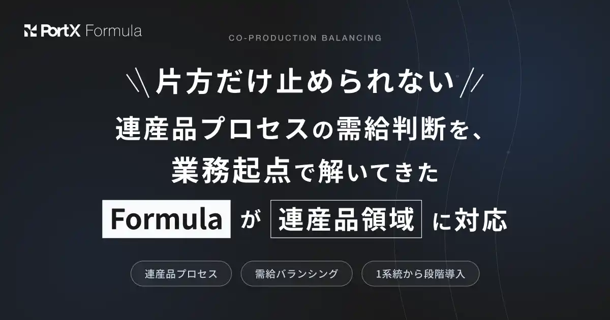 株式会社PortX(以下「PortX」)は、化学・素材メーカーなど連産品プロセスを持つ大手製造業を対象に、連産品の需給バランシングにおける意思決定を支援する取り組みを開始いたしました。 |