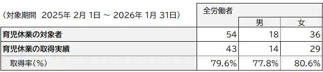 同社の育休取得率は、全体79.6%(男性77.8%/女性80.6%)と、男女ともに高水準を記録。 |