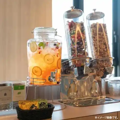 全自動コーヒーマシンやデトックスウォーター、お茶・紅茶6種類、スープ3種類、ナッツなどのスナックをご用意。 |
