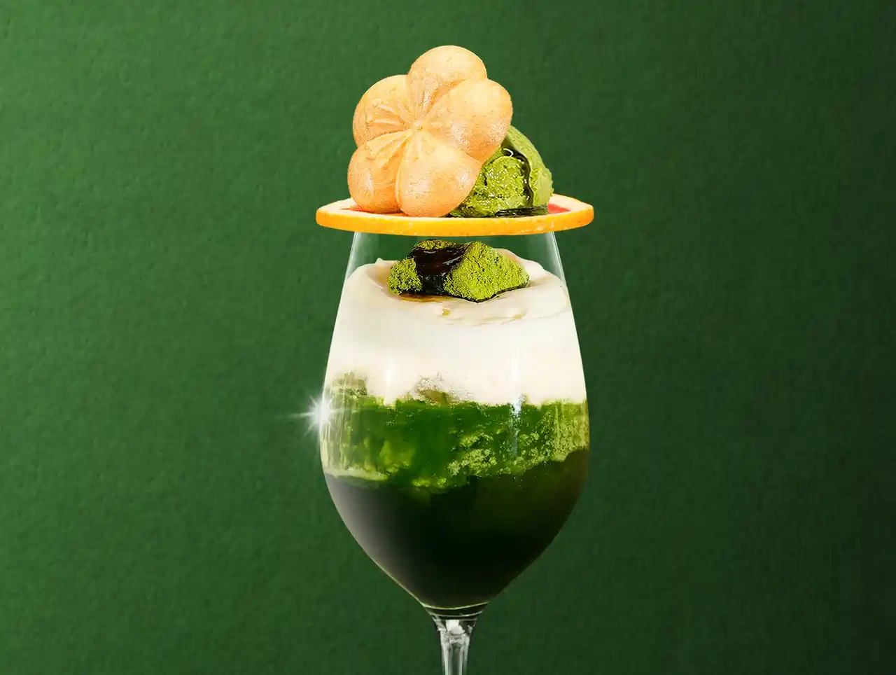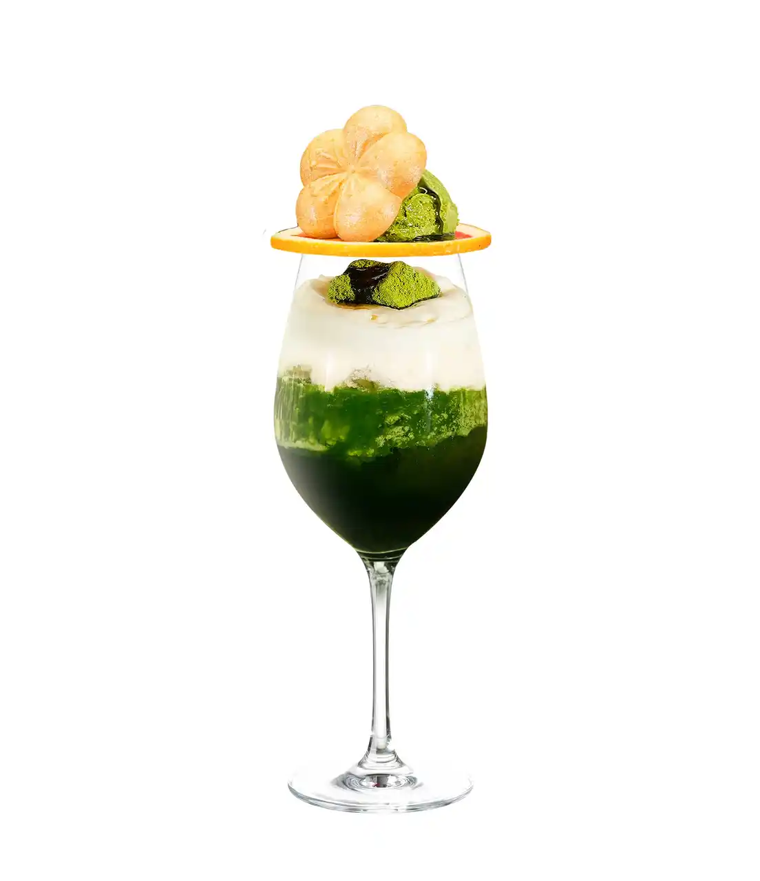 梅酒カクテルクリームソーダ MATCHA GRACEは、オリジナルの完熟梅抹茶のシロップと南高梅酒ベースにオーガニック抹茶とソーダを加え、クリーミーなヨーグルトエスプーマを重ね、梅抹茶のわらび餅を1粒乗せました。その上にスライスしたグレープフルーツで蓋をし、完熟梅抹茶のシロップをかけた抹茶アイスクリームを乗せ梅最中を添えました。濃厚な梅酒と抹茶の味わいにヨーグルトのまろやかな甘みと酸味が合わさったクリーミーで濃密な梅酒カクテルです。 |