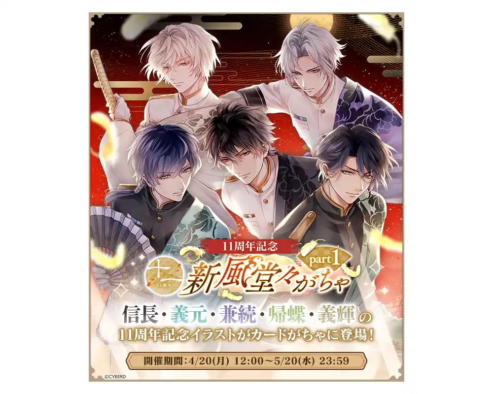『イケメン戦国 -永縁-』のアプリ内では、4月20日(月)12時00分より、11周年記念イラストを使用したカードガチャ「11周年記念◆新風堂々がちゃ part1」を開催します。 |