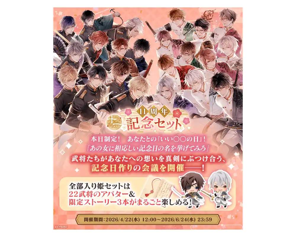 株式会社サイバード(本社:東京都品川区、代表取締役社長 兼 CEO 長嶋 貴之)が手掛ける、全世界でのシリーズ累計会員数4,500万人を誇る大人気恋愛ゲーム「イケメンシリーズ」の大人気作『イケメン戦国 時をかける恋』(以下、『イケメン戦国』)は、2026年6月22日(月)に11周年を迎えます。 |