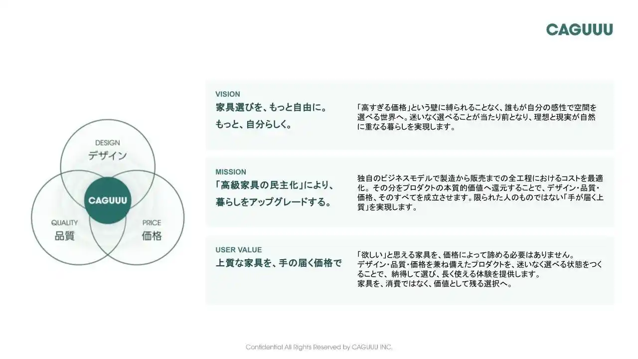 止まらないインフレにより生活コストが増大する現代において、家具選びは「高価なブランド品」か「安価な消耗品」かの二極化に直面しています。CAGUUUはこの課題に対し、独自のビジネスモデルで「良いものを買って、長く使う」という本質的な豊かさを提供し、急成長を続けています。 |