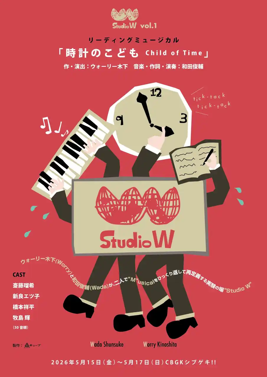 | 演出家・劇作家のウォーリー木下と、音楽家の和田俊輔が結成した創作ユニット「Studio W(スタジオダブル)」の第一弾公演として、2026年5月15日(金)から17日(日)までCBGKシブゲキ!!にて上演される、Studio W vol.1 リーディングミュージカル『時計のこども Child of Time』。 | |||
